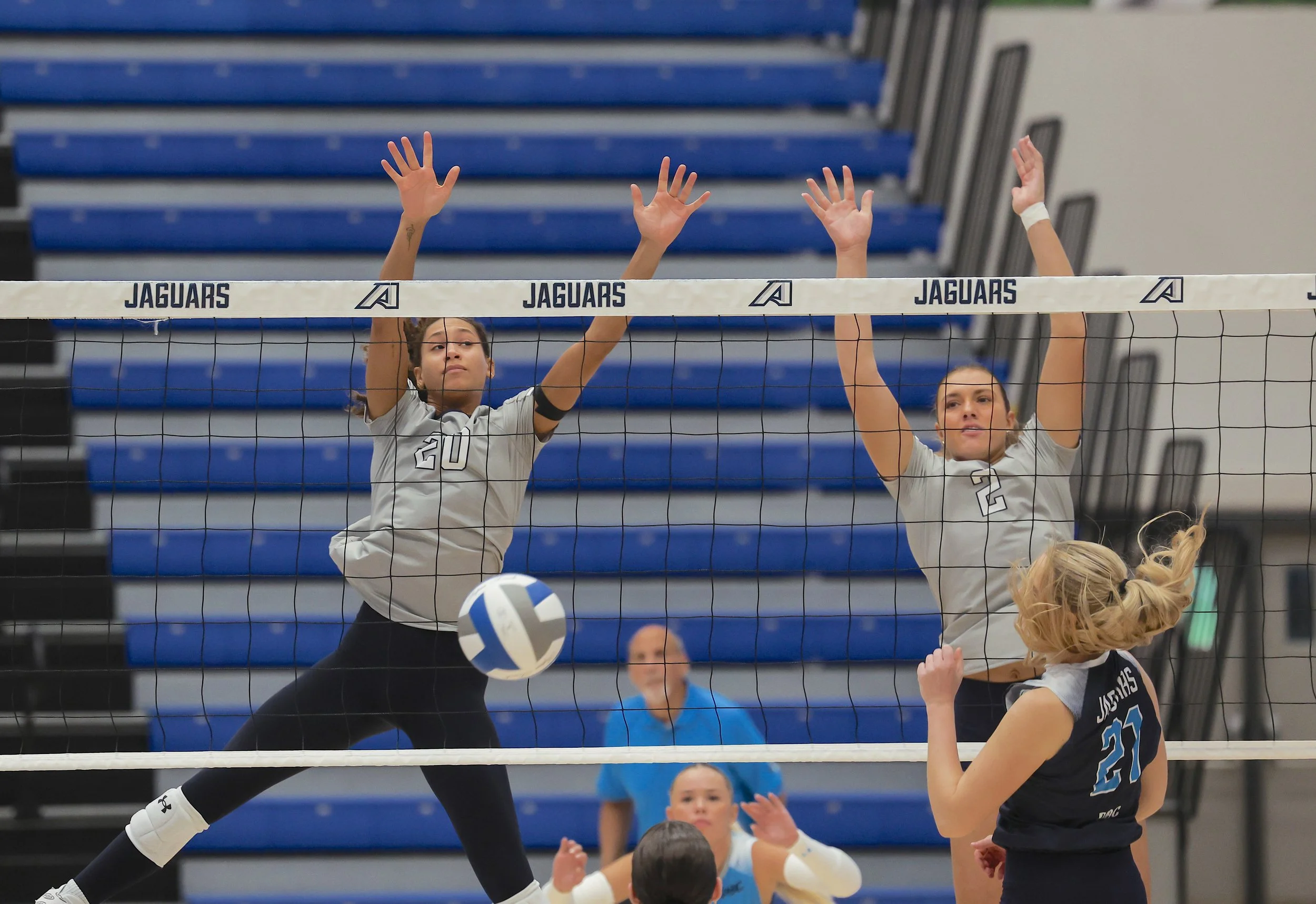 The Blue team won the first two sets by scores of 27-25 and 25-22. They Grey team took the third set 25-23.