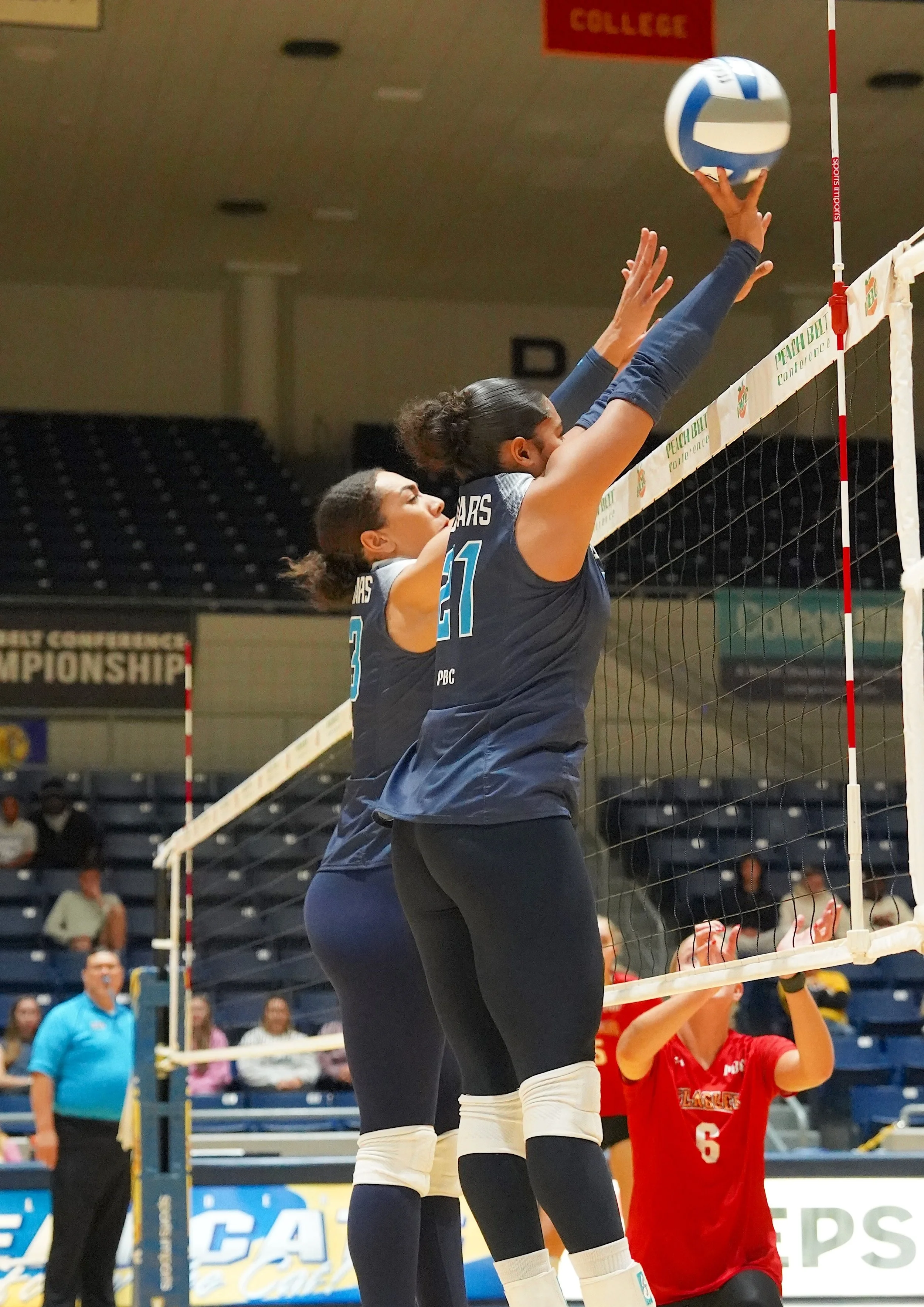 AU’s Janvier Buggs (21) and Jada Suguturaga (13) attempt a block against Flagler in the PBC championship match at Lander on Nov. 23. (photo by Domonic Macias, special to the Bell Ringer)