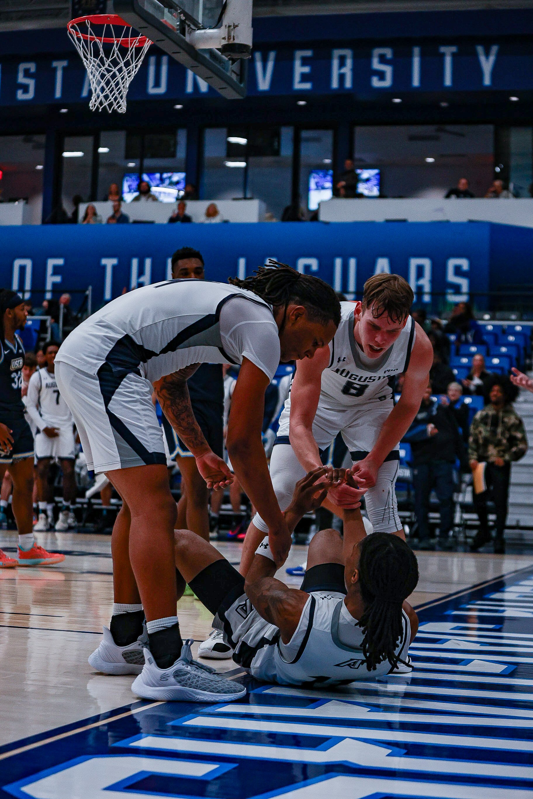 Kyndon Wilburg (on the floor) is helped up by DaRon Dumbar (left) and Elias Palsson (right) after a tough and-1 layup.