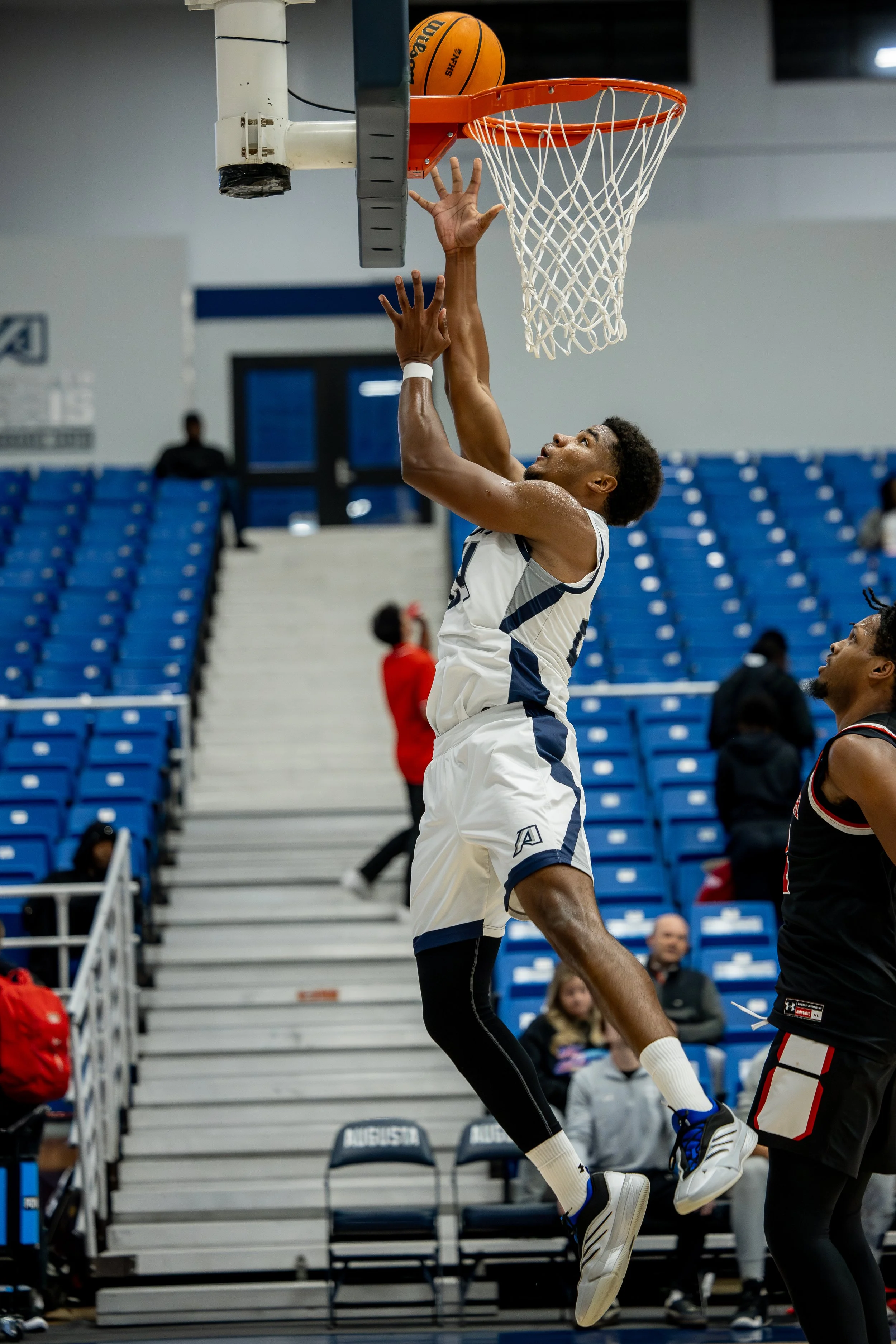 Luis Nonfon, getting a layup here, led all scorers with 18 points in AU’s 84-55 win over Georgia Southwestern in Peach Belt Conference action. (photo by Lydia Williams/the Bell Ringer)