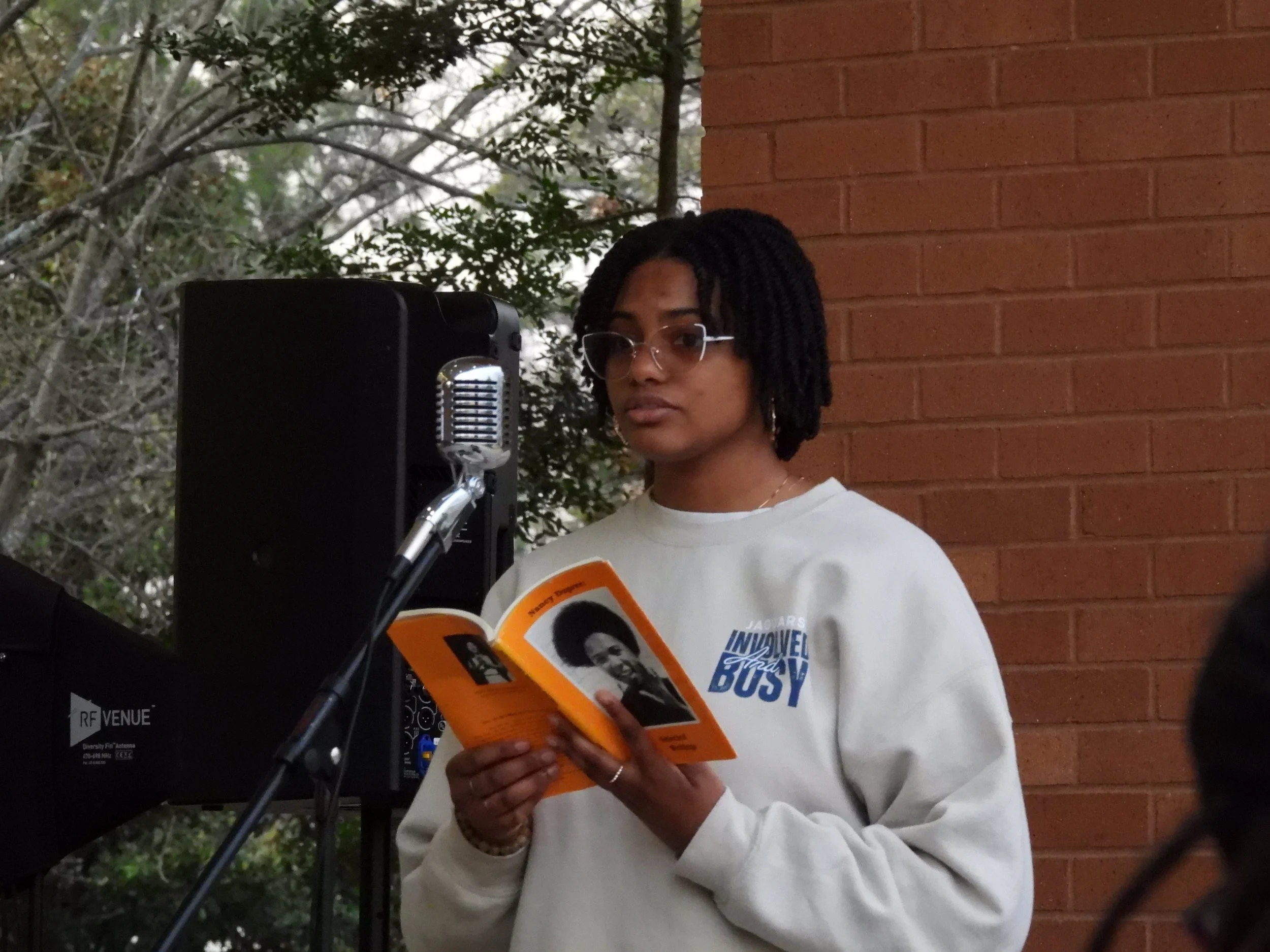 Lia Barnes reciting her grandmother’s poem “Happy 4th of July, Y’all. (photo by Gabriel McKee/business major)