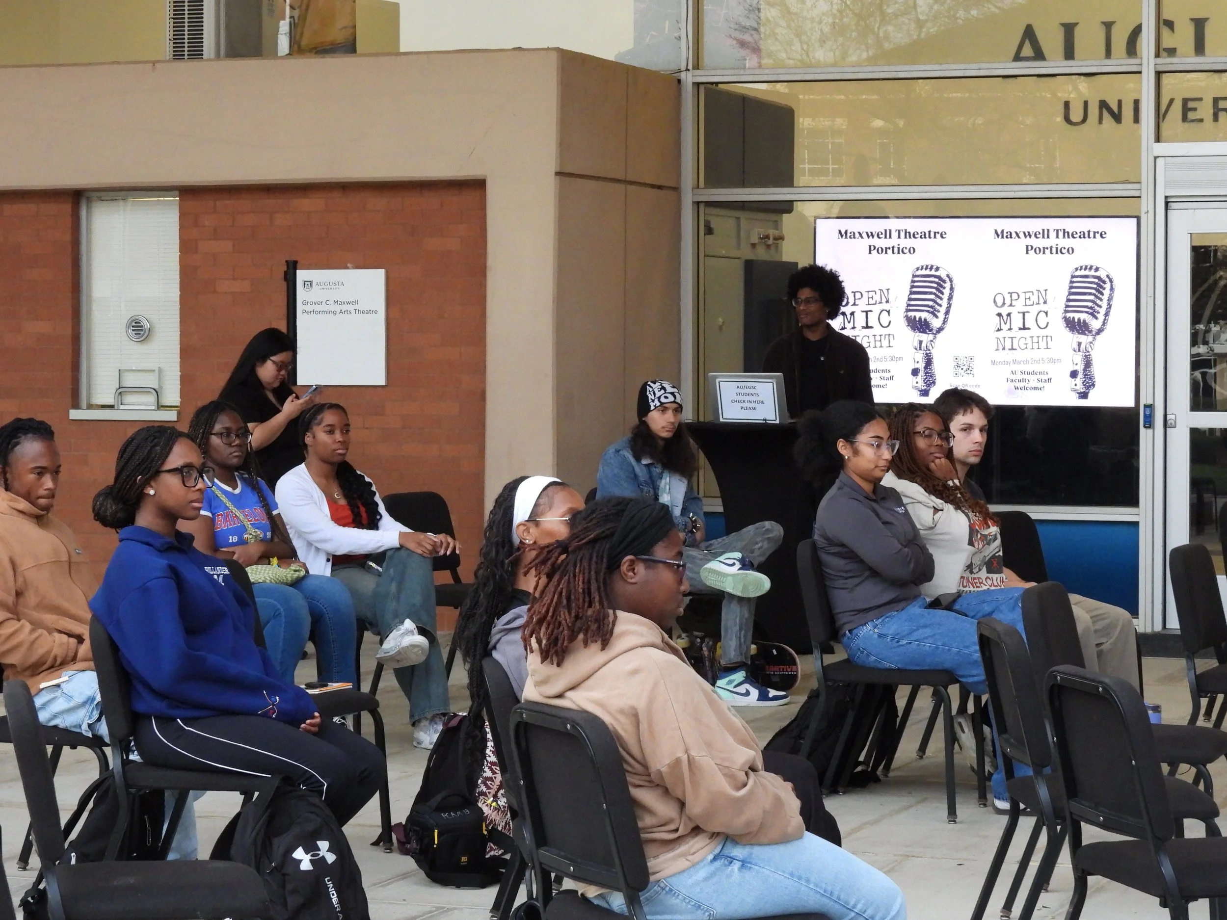 I have done a few open mics hosted by AU organizations and Resident Assistants before. Nearly all those open mics required signing up beforehand. The Maxwell open mic night, however, gave students the opportunity to perform their talents without signing up as well as signing up beforehand. If you would like to sign up beforehand, send Maxwell Theatre a message of what you want to do and the materials you need on their Instagram page, aug_maxwelltheatre, and they will have it set up for you. I did not sign up beforehand, but it was no problem because the organizer, Coco Rubio, offered for students to get on the carpet stage without signing up.