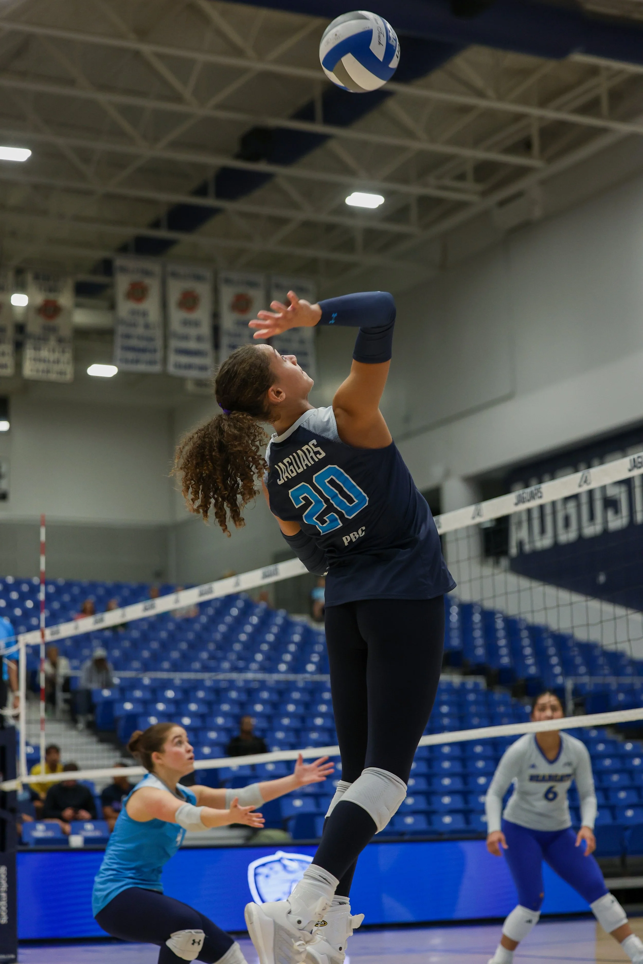 Layne Witherspoon, with the kill here, earned all-conference first-team honors for the 25-8 Jaguars, who open play in the NCAA Division II Southeast Regionals against Anderson University on Thursday, Dec. 4. At the top of the page, Witherspoon (20) has been a dependable attacker in the middle of the net and on the slide, totaling a team-best 336 kills through PBC Tournament play. Teammate Sydney Harrington (13) watches Witherspoon’s attack. (photos by Lydia Williams/the Bell Ringer)