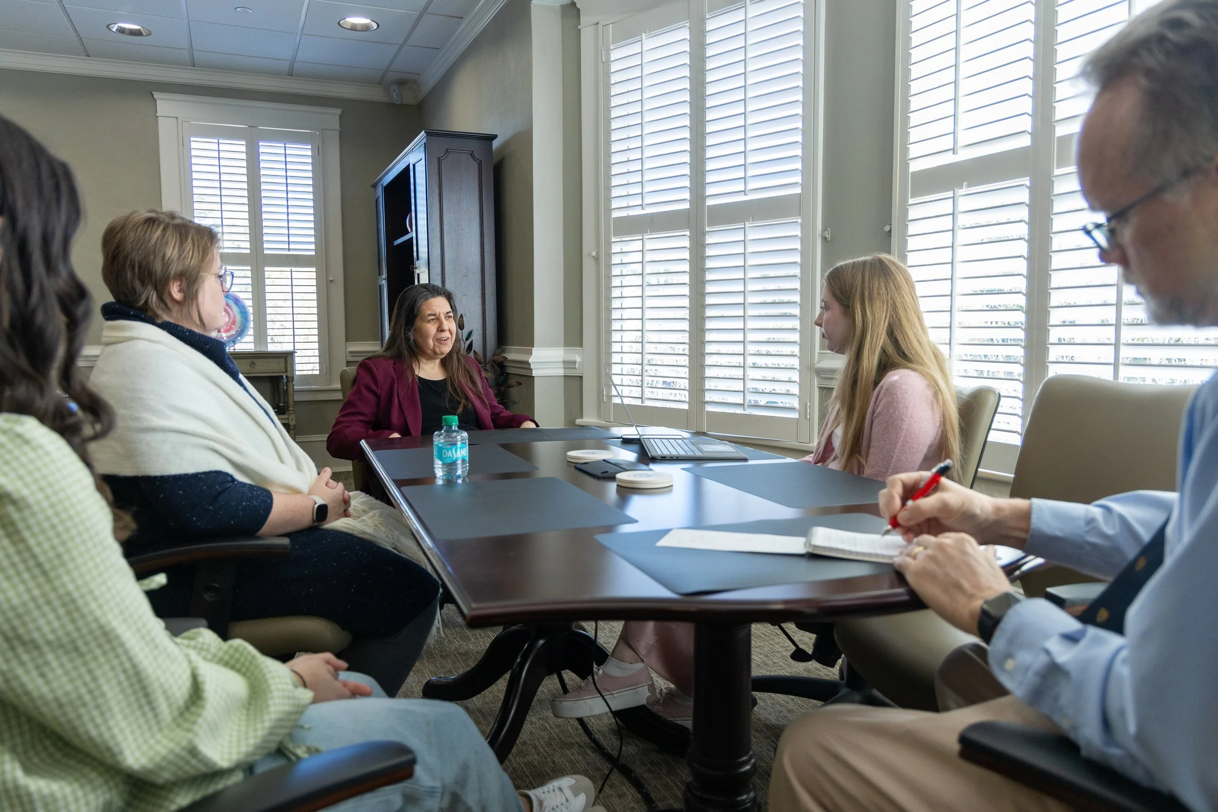 Provost Maggy Tomova’s meets with Bell Ringer news editor Caelyn Dockal, associate professor Carrie Reif-Stice, Rose Murray and professor David Bulla. (photos by Lydia Williams)
