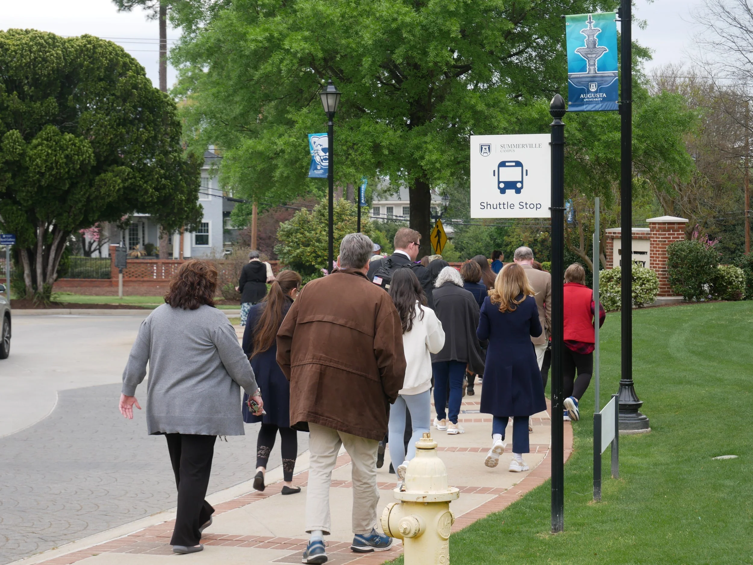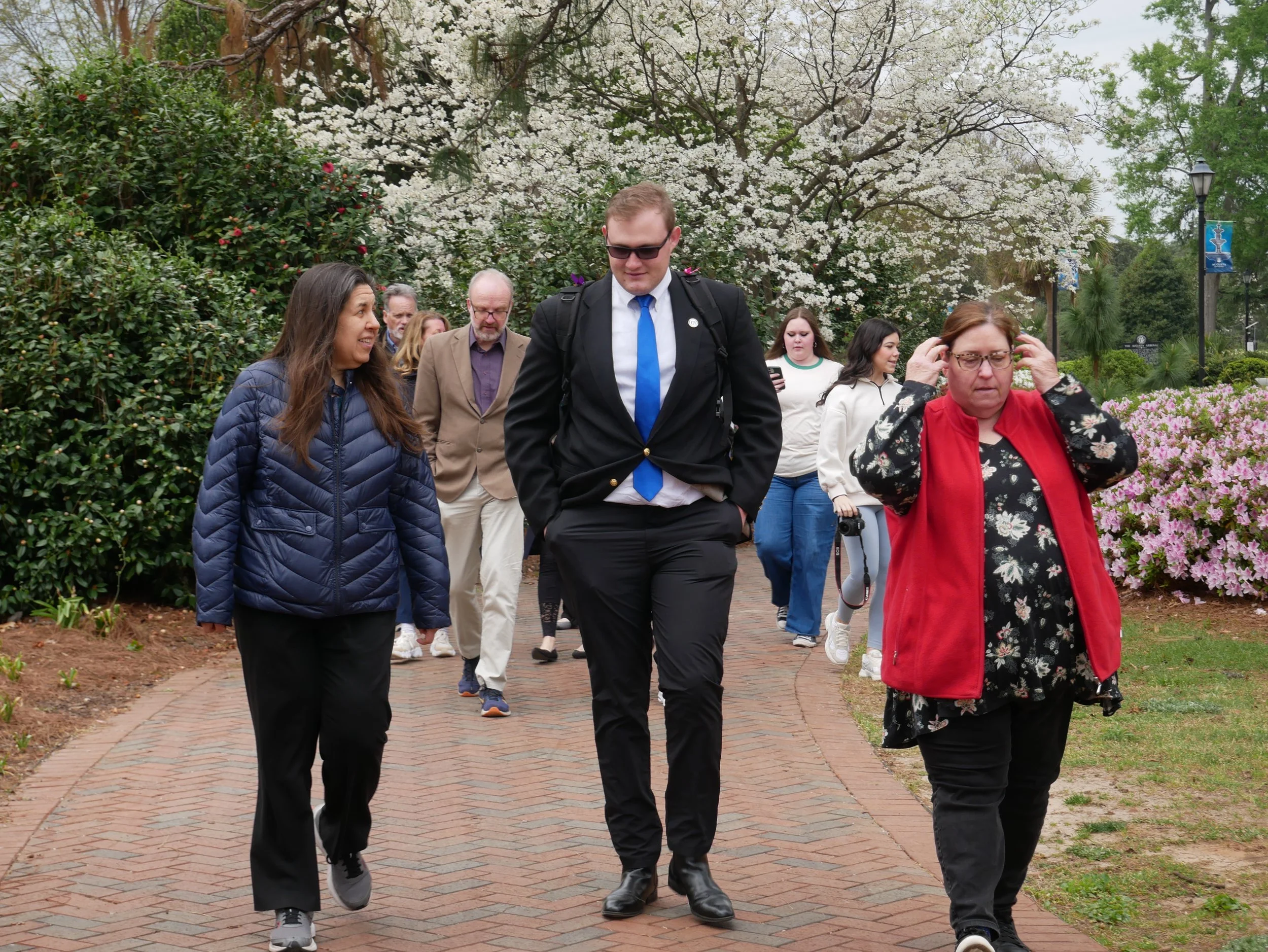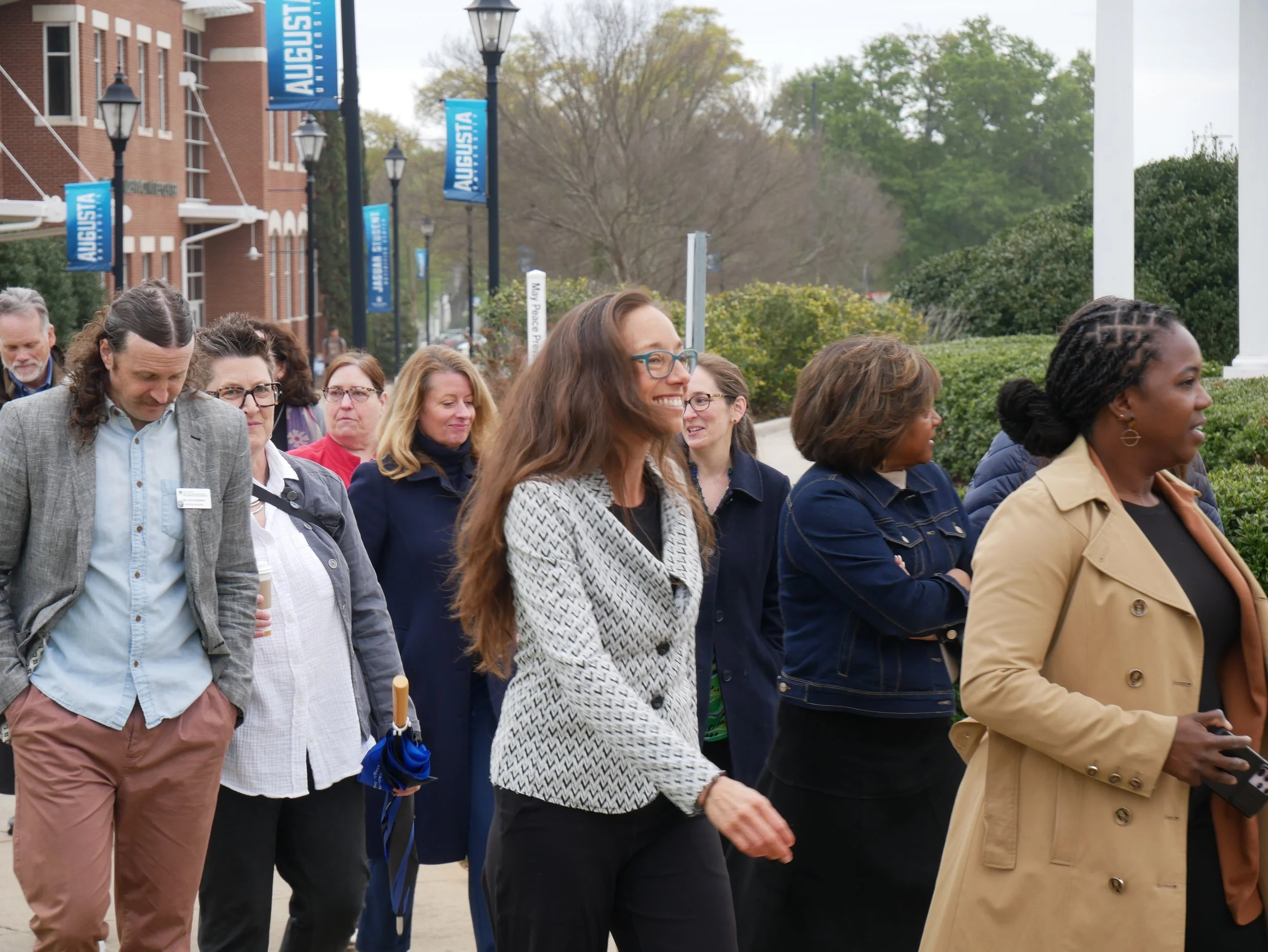 Faculty, students and staff walk with the AU provost on the Summerville Campus. (photo by Caelyn Dockal)