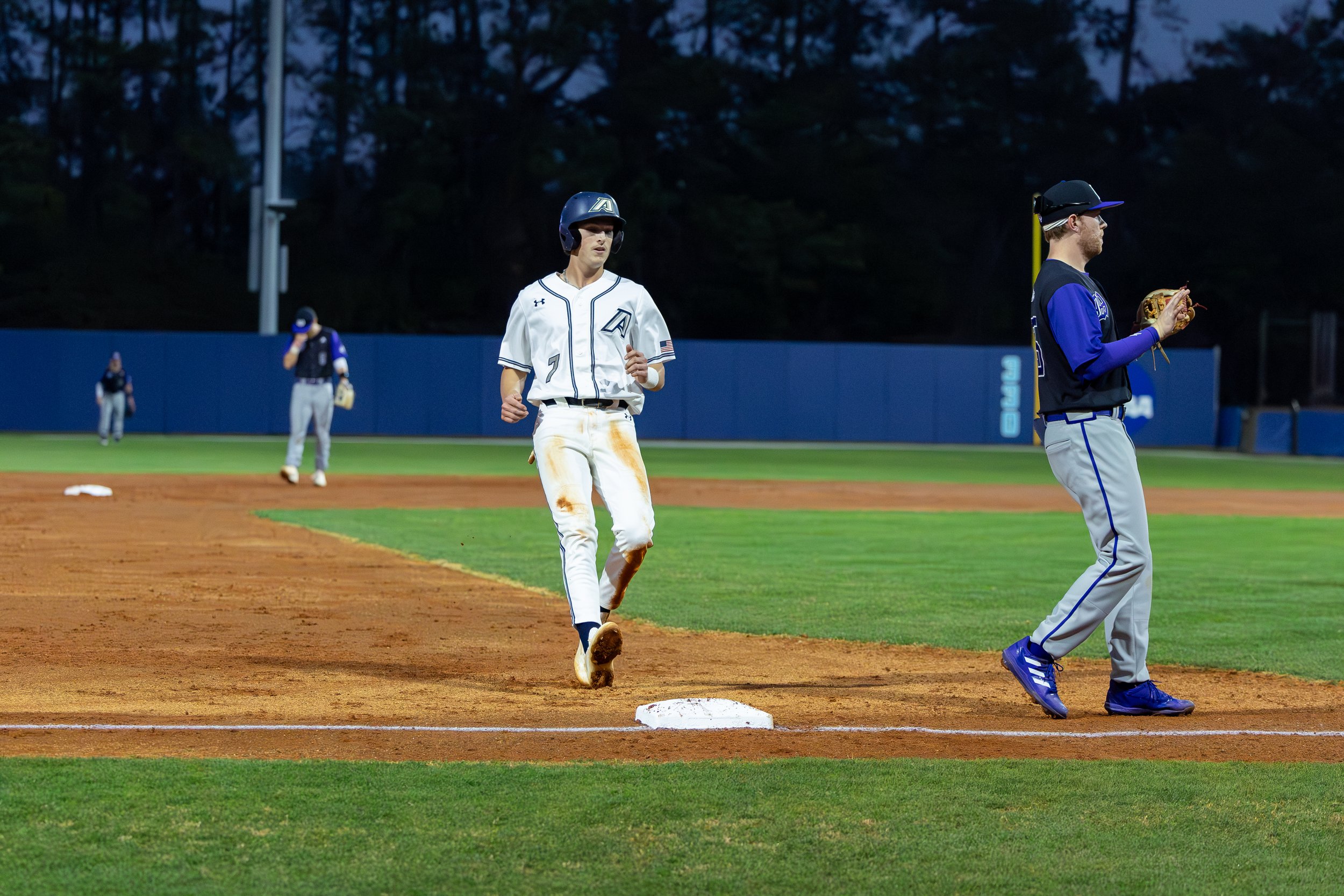 Nolan Turner (7) reaches third base during a game last season. At the top of the page, Turner takes a huge swing during the rivalry game against USC Aiken at SRP Park. (photos courtesy of AU Athletics)