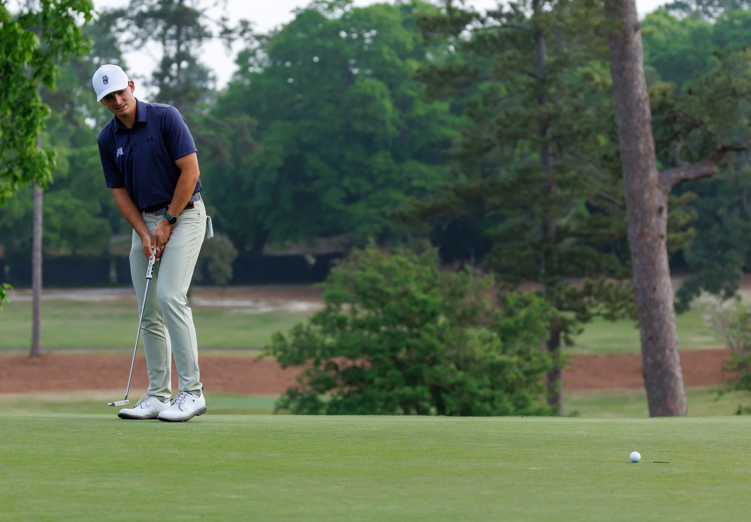 AU golfer Stefan Jacobs putts during the Haskins Award Invitational at Forest Hills Golf Club. At the top of the page, Dean Wilken blasts out of a sand trap. Wilken and Jacobs each shot under par to lead the Jaguars to a 10th-place finish in the team race. (photos by Paula Toole/AU Athletics)
