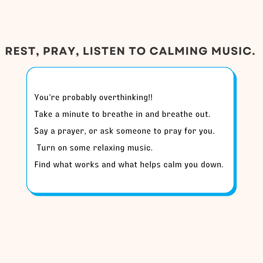 Tip 5: Simply rest and pray. Just like me, you are probably overthinking. In my situation, I am panicking a lot to the point where my heart has not stopped beating super-fast and my stomach has not been normal. Try to take some deep breaths and calm yourself down. Listen to some calming music. Once you have somewhat cleared your mind, try to do a prayer for yourself. If possible, have other people pray for and with you. One solid prayer can go a long way.