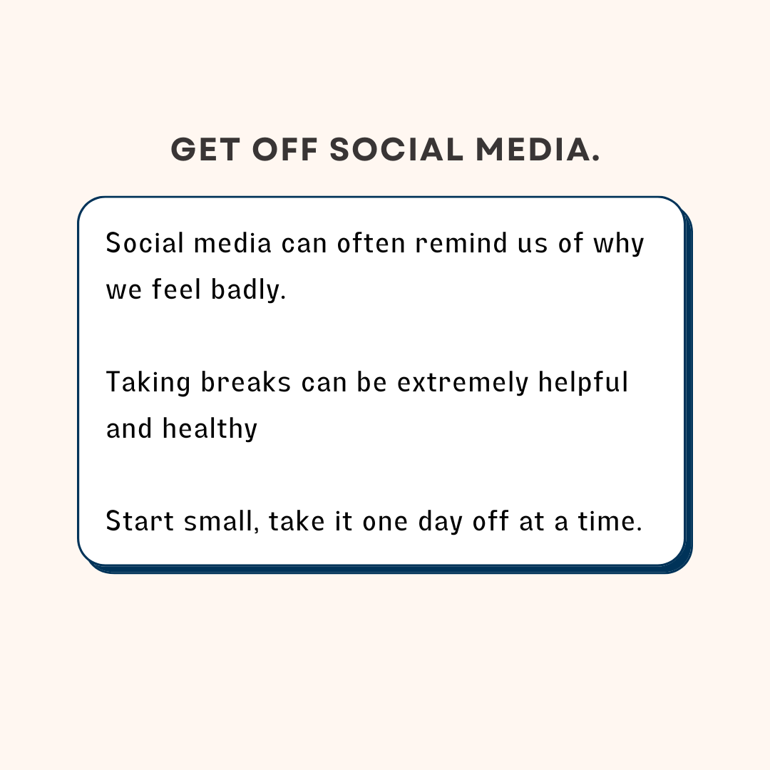 Tip 2: Get off of social media completely. I would suggest at least a day minimum if you can manage. Social media could remind you of why you feel the way that you feel. Even worse, you could see someone else happy and feel sad or angry all over again. You need to get off of social media for as long as you can manage and try to manage your mental health.